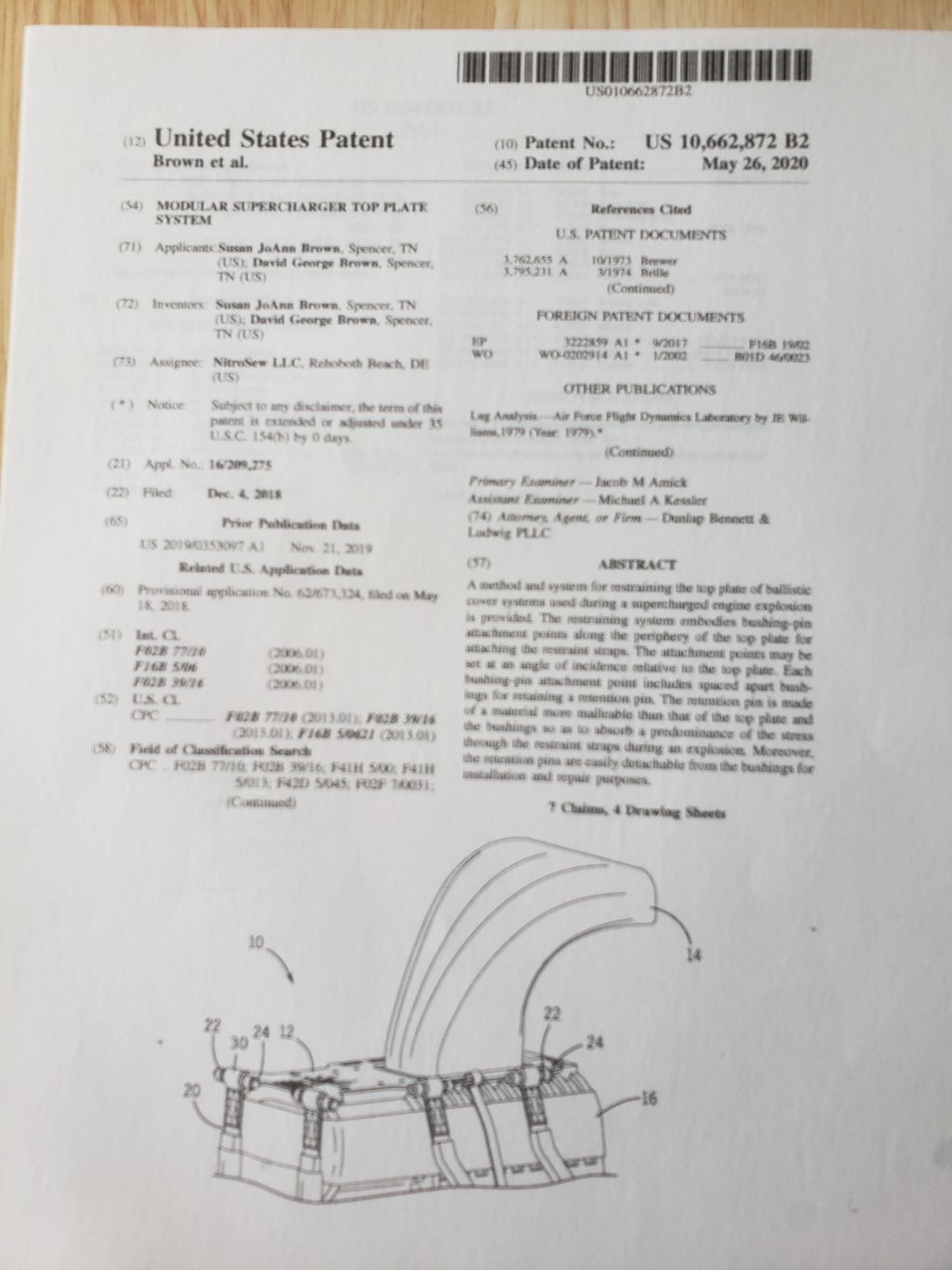 Designed for Top Fuel Application it provides unequaled protection. It revolves around the configuration of two rear restraints that align a Ballistic Blanket between them that covers the rear of the Supercharger / Engine and moves along with the Supercharger in the event of explosion. It acts to absorb fragmentation and dissipate energy during any such event. Those restraints are tethered to